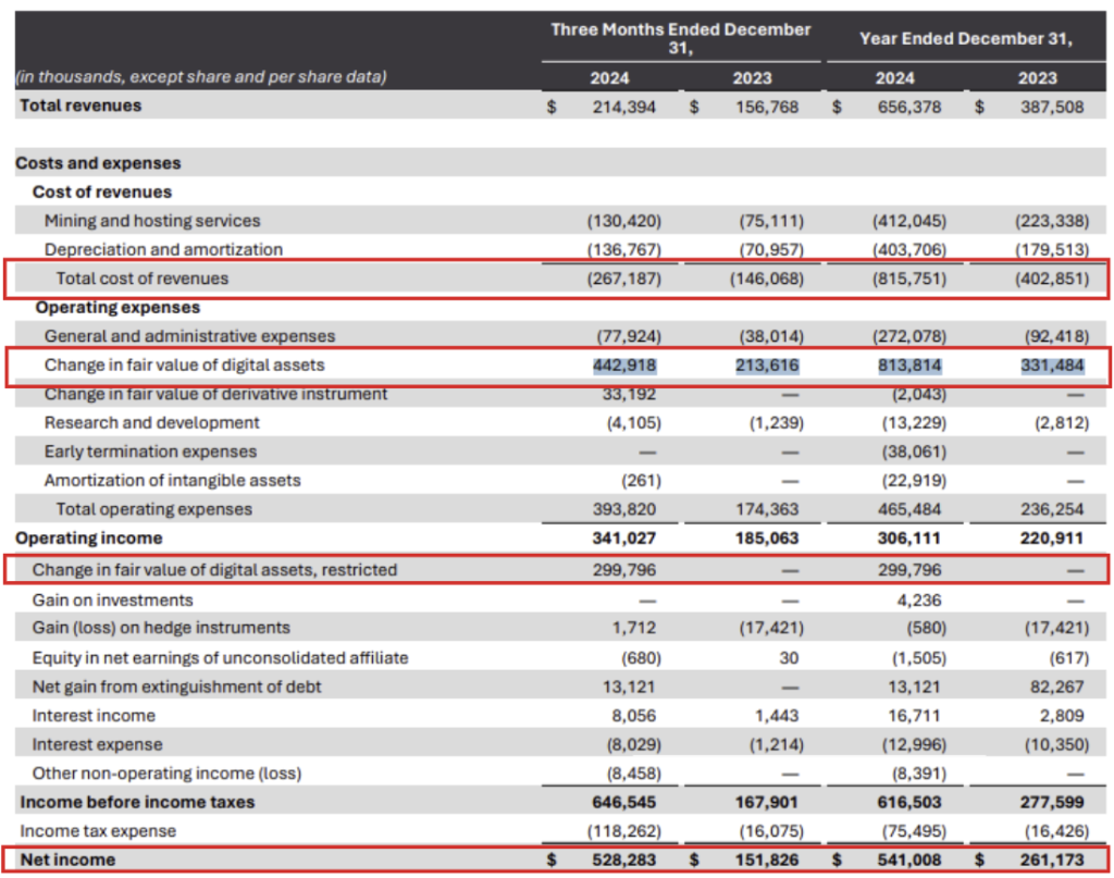 不过,细看其财务报表,在2024年第四季度,公司的净利显著增加,主要原因之一就是数字资产的公允价值变动。根据报告,公司在第四季度的数字资产 (包括比特币应收款) 的公允价值收入为 7.4 亿美元。