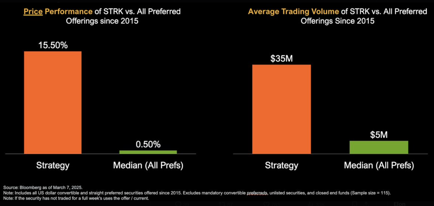由于 STRK 是先由机构投资人认购后再上二级市场交易,Strategy 在一月底第一次发行近六亿的优先股,发行价为 80 美元,一上二级市场价格就由 85 美元一路上行,相较于普遍流动性较差的优先股,其交易量和表现都还算不错 (笔者认为折价发行也是重要原因之一)。