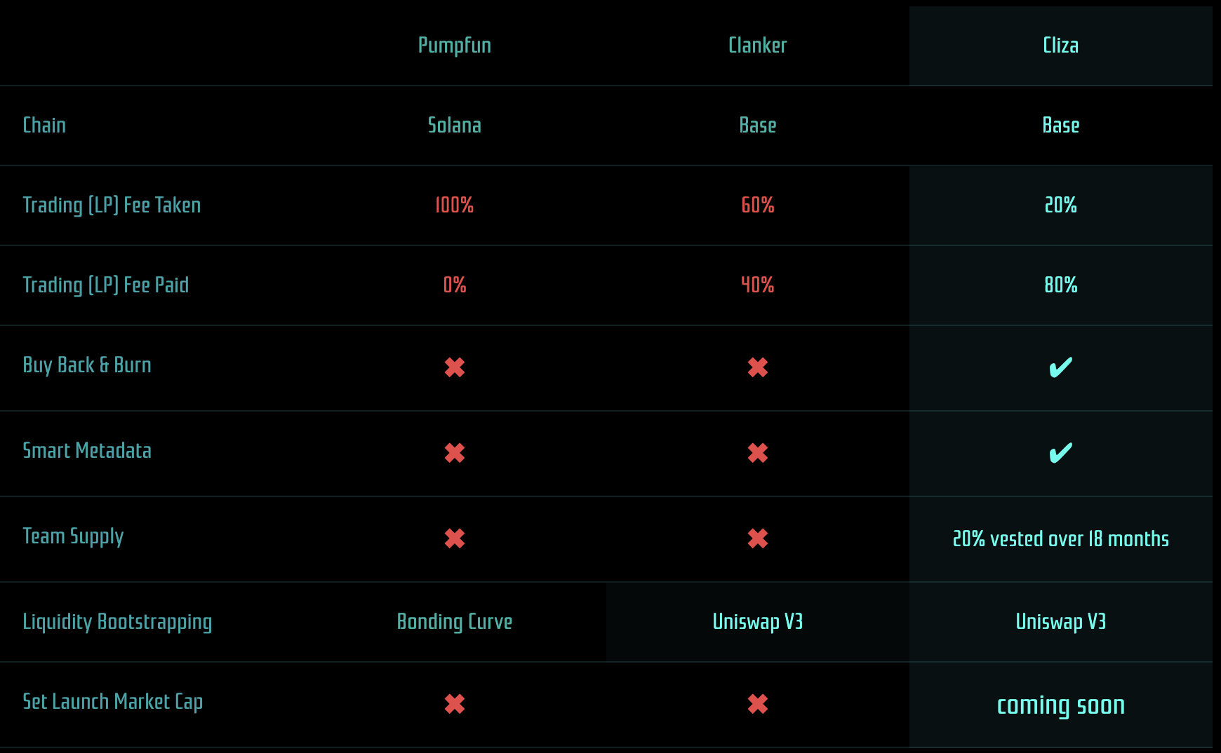 不过我们从官网提供的比较图可以察觉,CLIZA 想要对标的不是 DeFAI 赛道的 Bankr,而是 Solana 和 Base 链上的两大发射平台 Pump.fun 与 Clanker,在图表中,CLIZA 列出相较于其他两个发射平台的优势,其中包括: