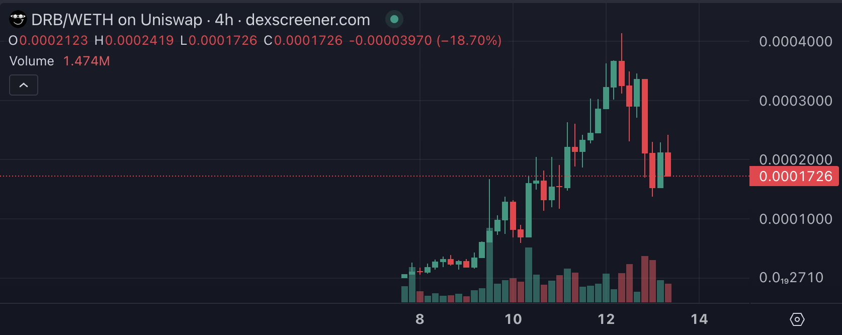 DexScreener 数据显示,DRB 市值原本在 100 万美元至 250 万美元之间震荡,在 Grok 罕见推广代币后,DRB 在昨(12)日创下历史新高,市值一度突破 4000 万美元。虽然当前 DRB 市值已回调近 60%,不过这也引起市场对「机器人发币」的关注。