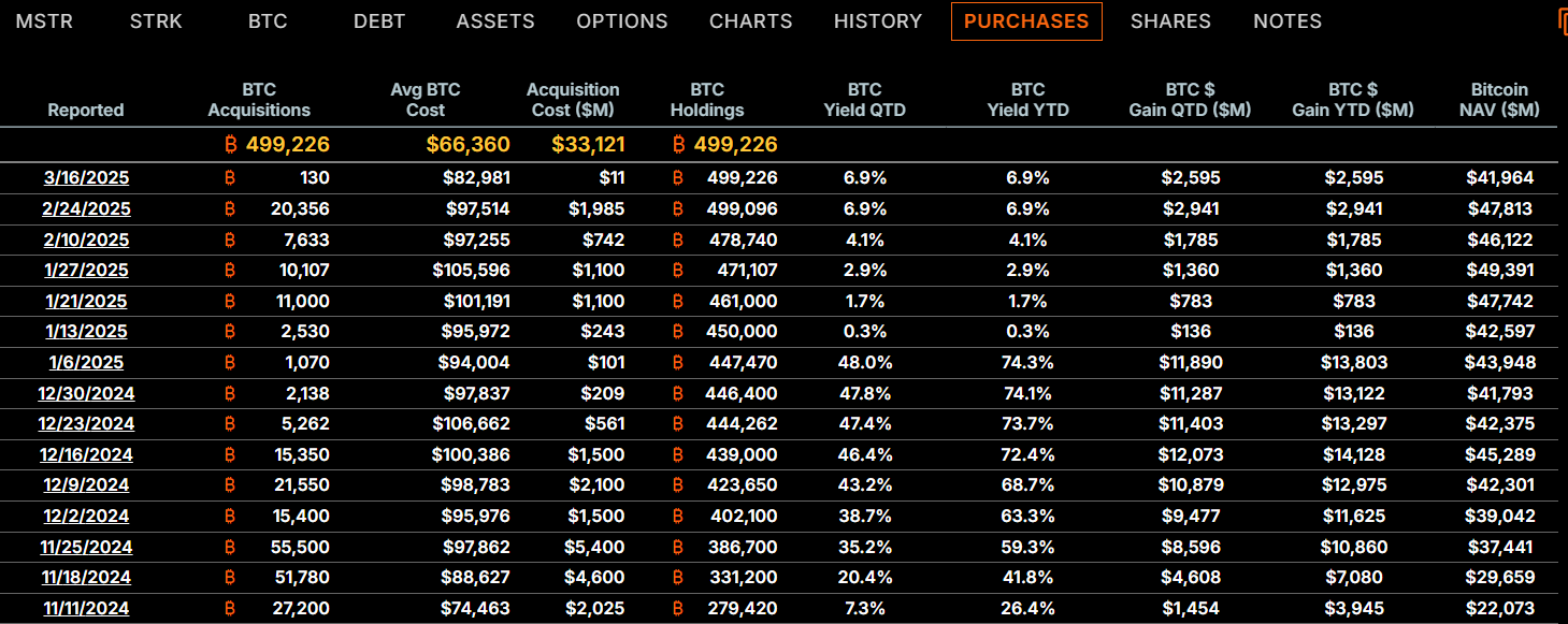 而 Strategy 最近一次的比特币购买,仅花费 1,100 亿美元购入 130 枚比特币,更是自川普胜选后的最少购买量,也让人不禁怀疑其比特币策略是否能无限制的扩张下去!